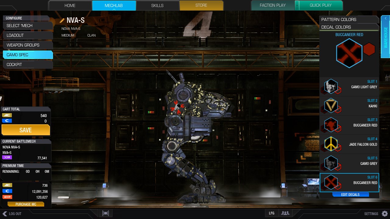 Here is a larger shot of the finished badge. Each of these basic elements cost about a dollar worth of MC at the worst purchase rate of 6.95 for 12500 MC. After you purchase a decal you may use it on any of your mechs at any time so they are really quite a good deal. Of course the special decals cost a bit more but that is to be expected. Each element can be colored using the colors you own just like you would for a camo pattern. The decals do tend to render colors brighter than they will show on your pallet so keep that in mine.
